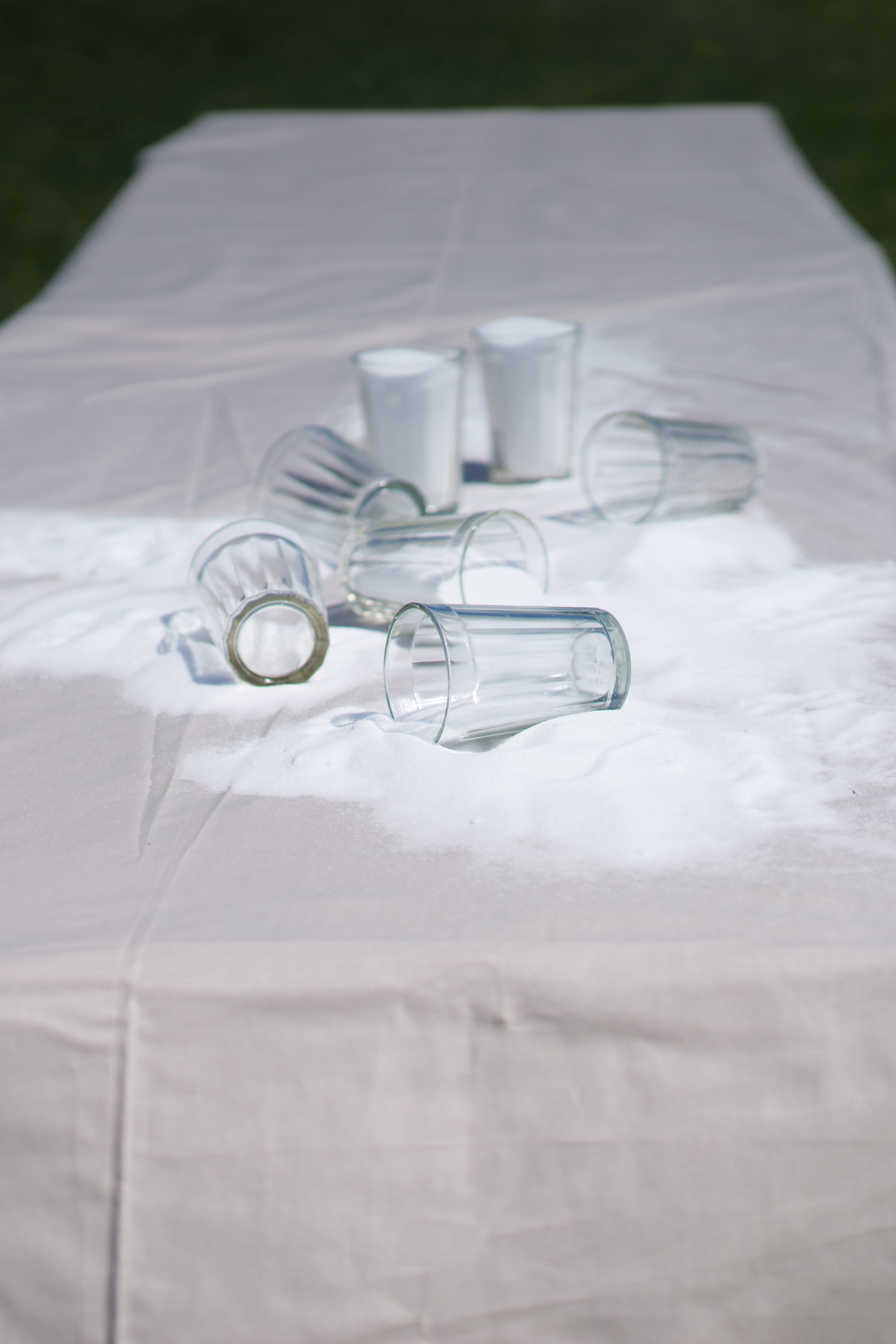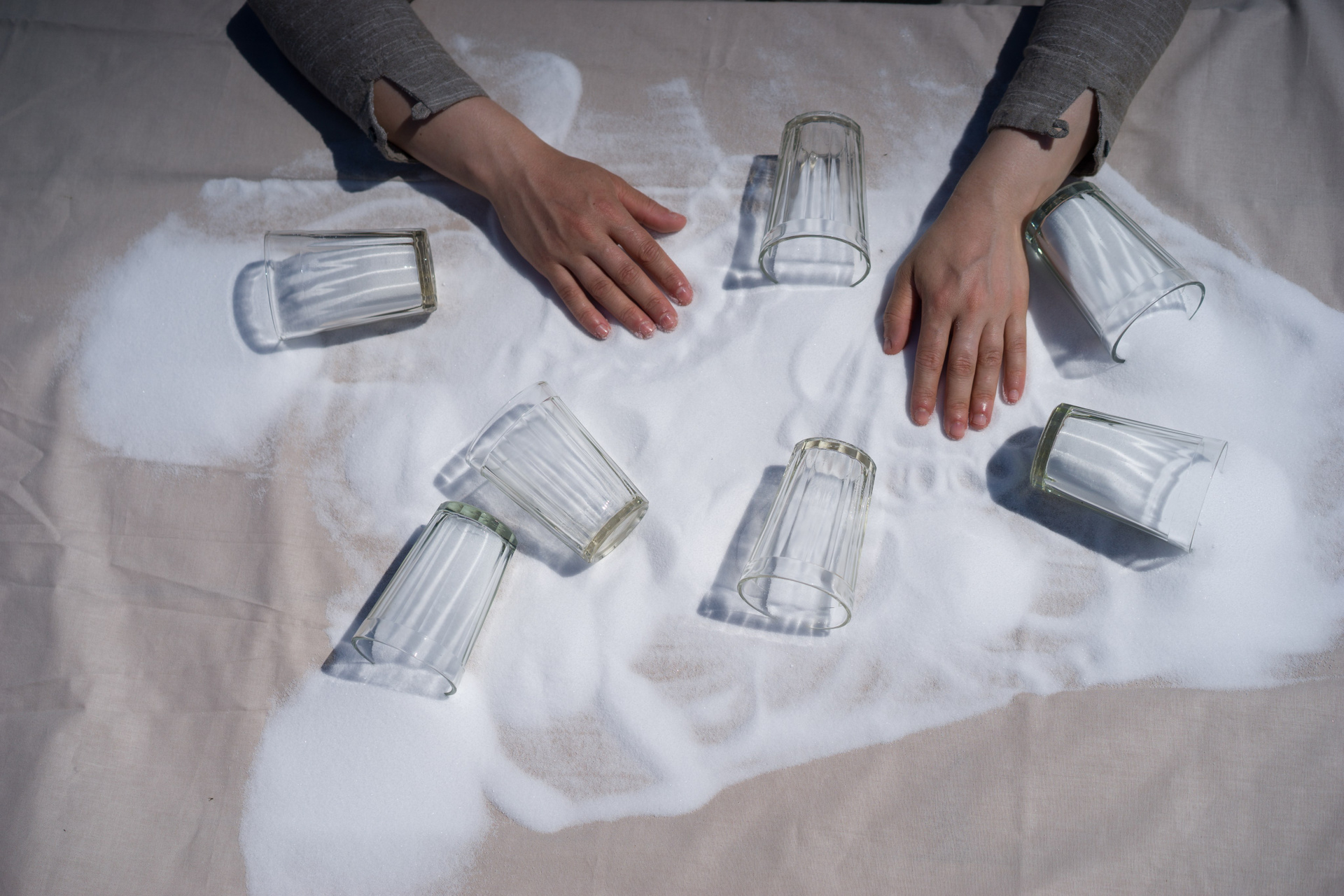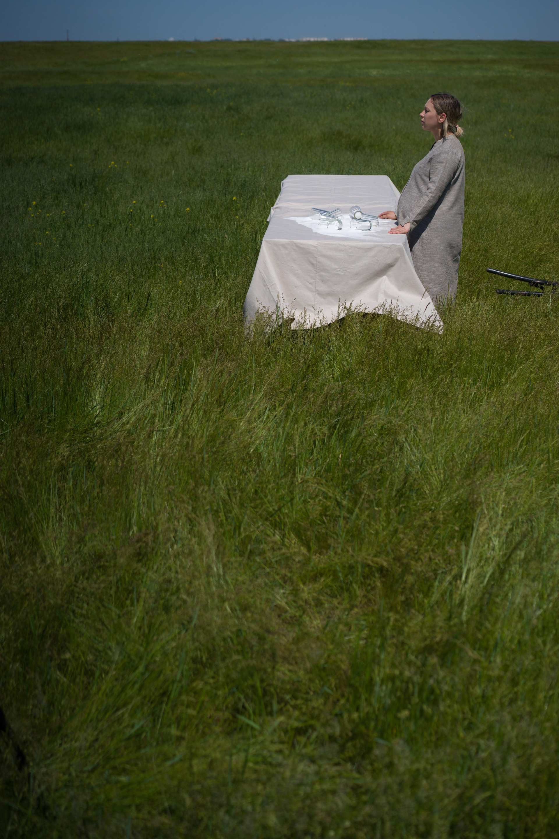 В бескрайнем поле ветер колышет шелковистые стебли высокой ярко-зеленой травы, скатерть на столе, пряди волос молодой женщины, погруженной в свои мысли; скользящие тени стремительно летящих облаков вторят порывам ветра. Очнувшись от тягостных размышлений, женщина повторяет текст заговора и собирает рассыпанную на скатерти соль в стаканы, пока не заполнит их все. Заканчивается перформанс длящейся картиной непоколебимой гармонии природного мира и стоящего в поле стола с собранной в стаканы солью.